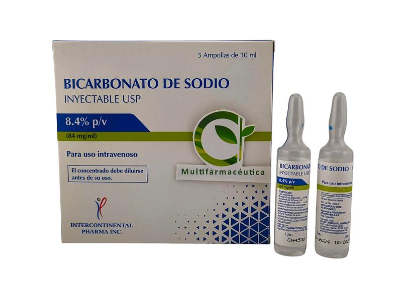 El bicarbonato de sodio 84 mg/mL es un medicamento de uso hospitalario indicado para la corrección de la acidosis metabólica y otras alteraciones del equilibrio ácido–base. Se presenta en solución inyectable estéril, lista para uso intravenoso, bajo estricta supervisión médica. Su formulación permite una acción rápida y efectiva en situaciones clínicas que requieren alcalinización sanguínea.